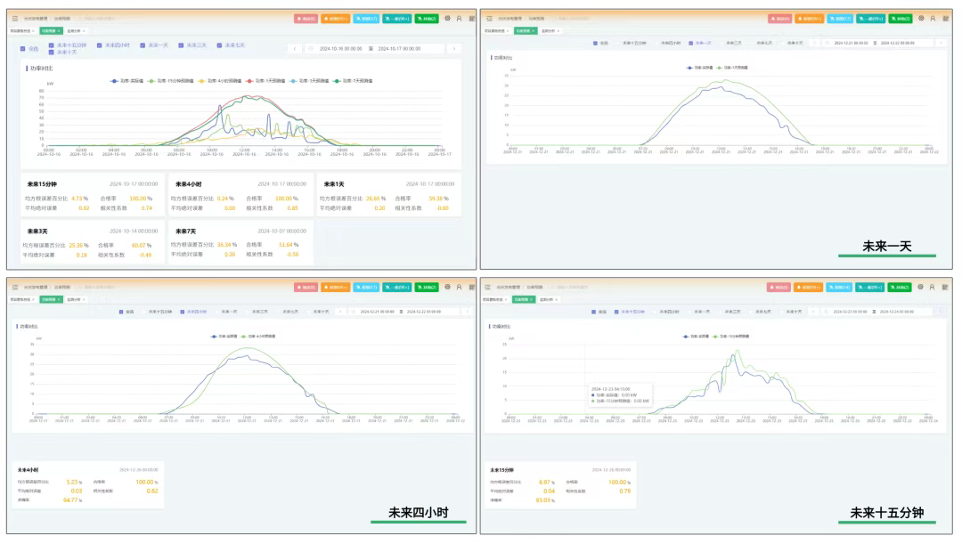 利用時序注意力機制,捕捉氣象周期特征,依托動態神經網絡等策略針對不同光伏場站實現模型自適應更新,對15min、4h、1d、3d、7d等多時間尺度下光伏出力進行高精度預測,為電站運營管理提供科學依據。